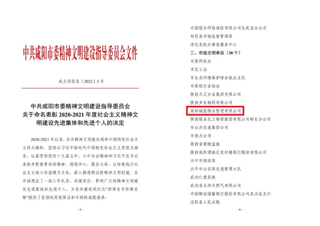 近日,從咸陽市文明辦《關(guān)于命名表彰2020-2021年度社會主義精神文明建設(shè)先進集體和先進個人的決定》中獲悉,咸陽城投物業(yè)公司被授予市級文明單位榮譽稱號。
