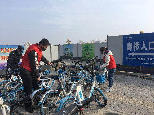 志愿者協(xié)助保安對(duì)廊橋引橋主口、西口的共享單車進(jìn)行規(guī)范擺放