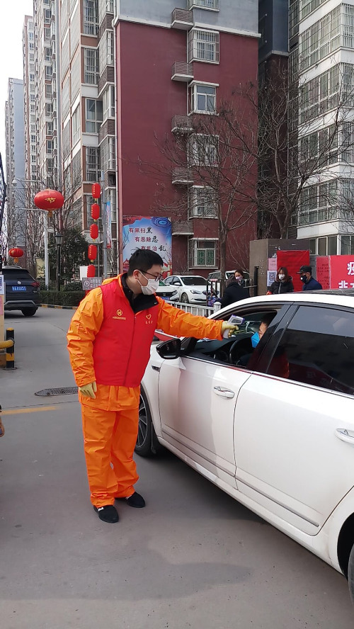 志愿者對(duì)進(jìn)入小區(qū)車輛上的司乘人員進(jìn)行測溫